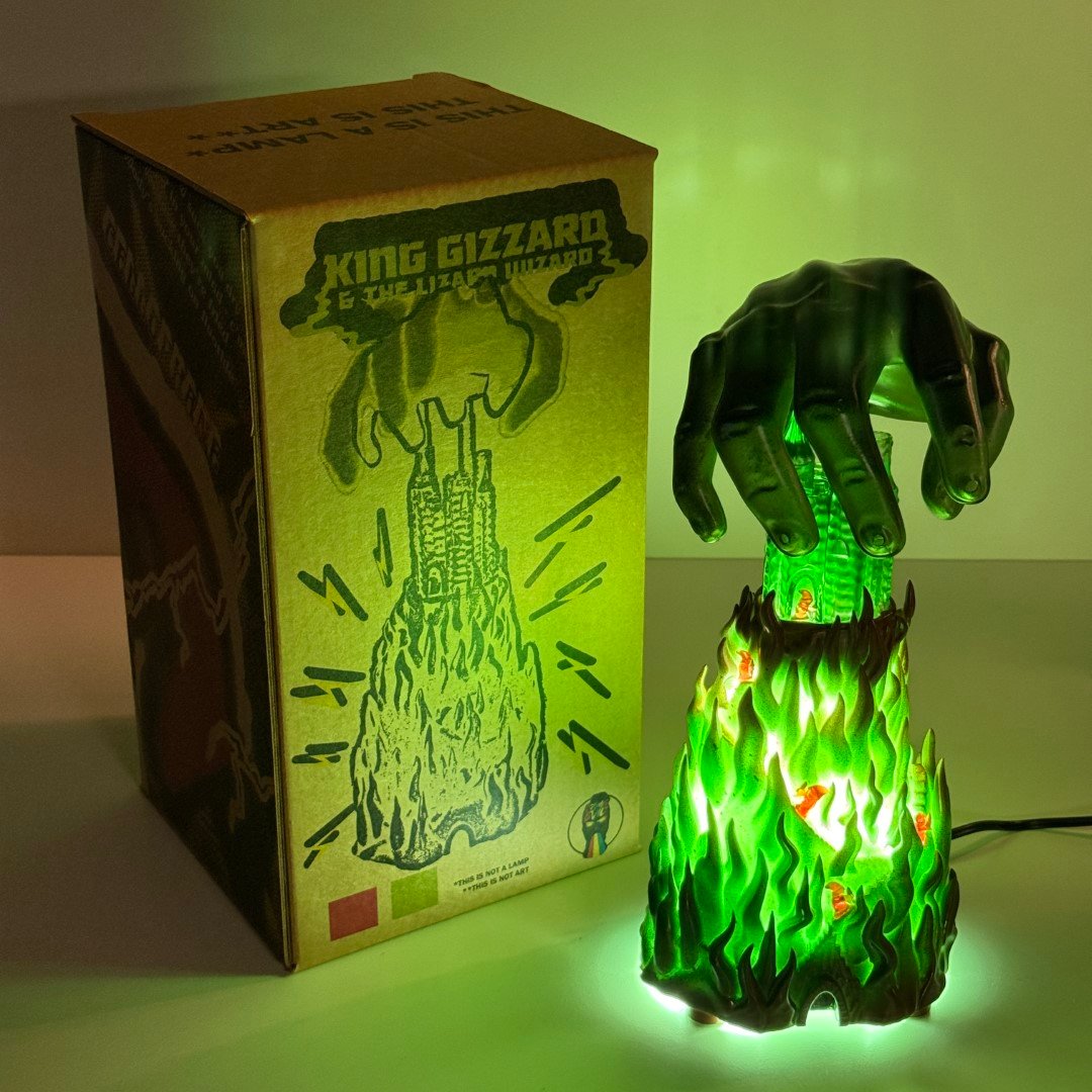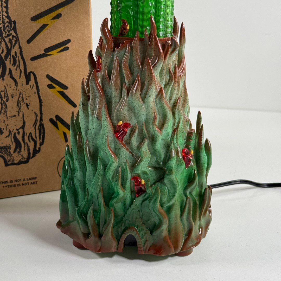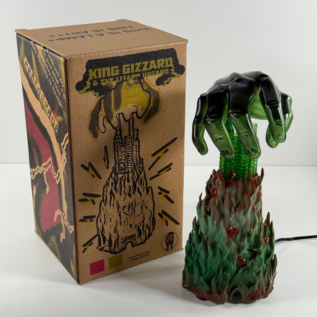 Scratch built art sculpture lamp based on Jason Galea's I'm In Your Mind Fuzz LP cover artwork, based on the 1983 Fortress Video Game box art. This is 13" tall with a corded 100w LED light. Comes in a custom box.