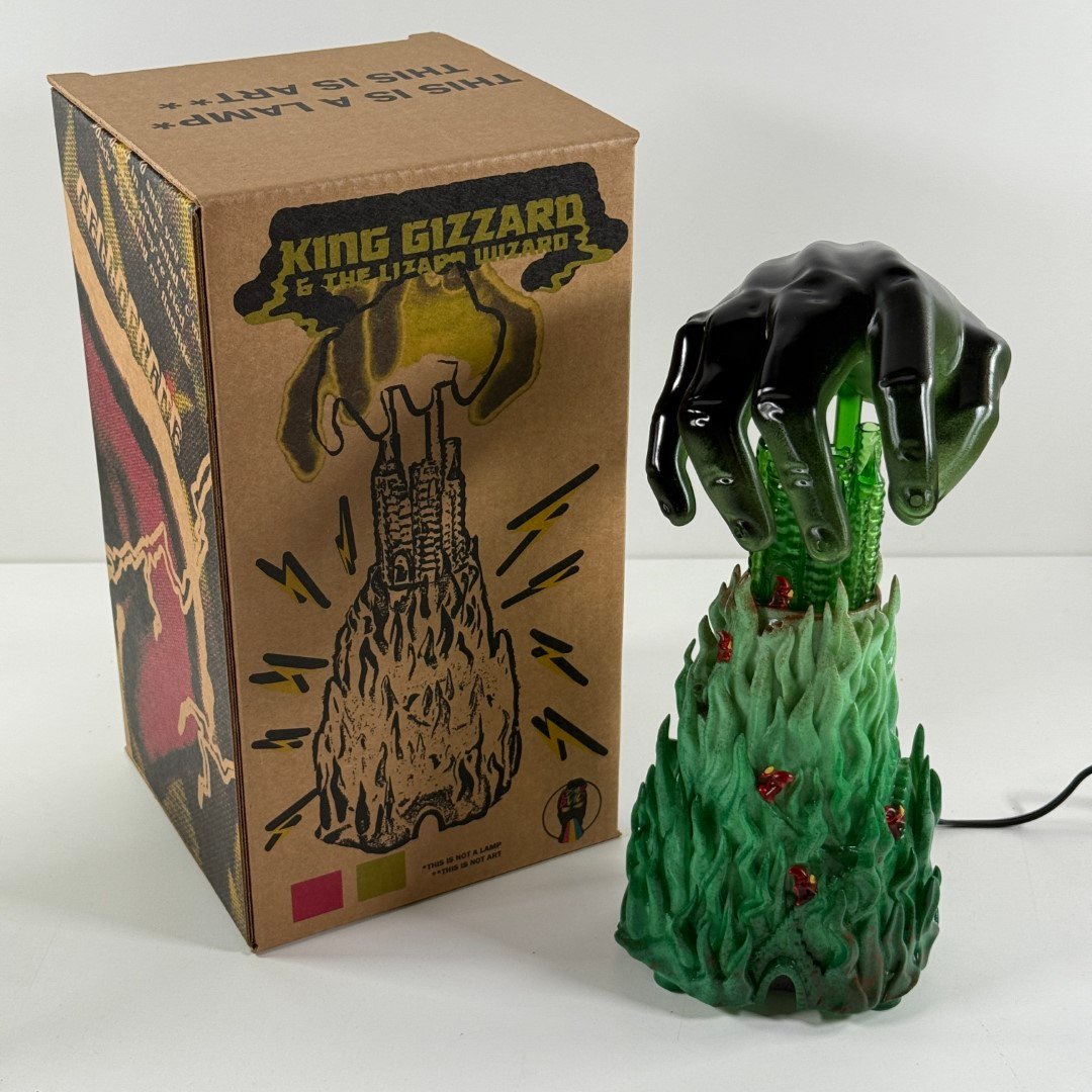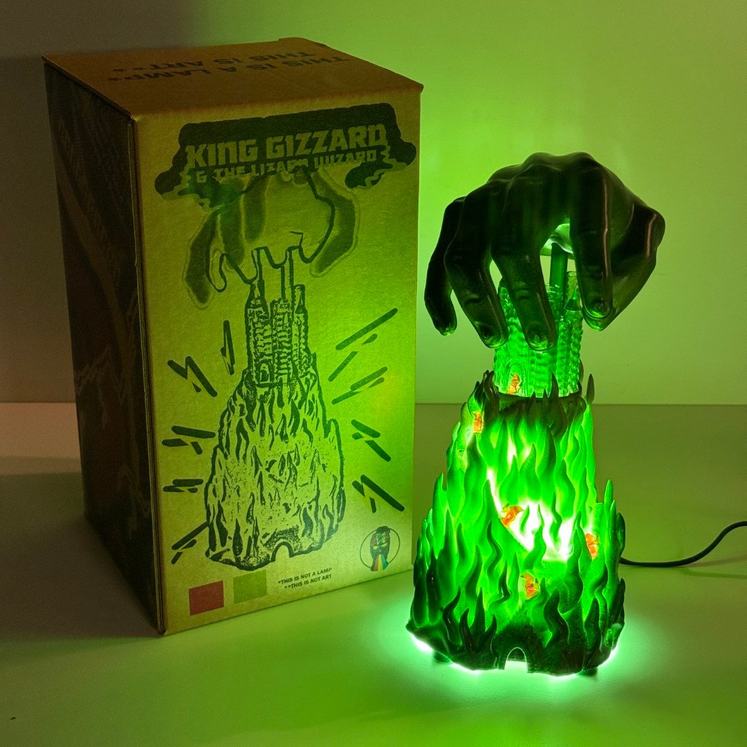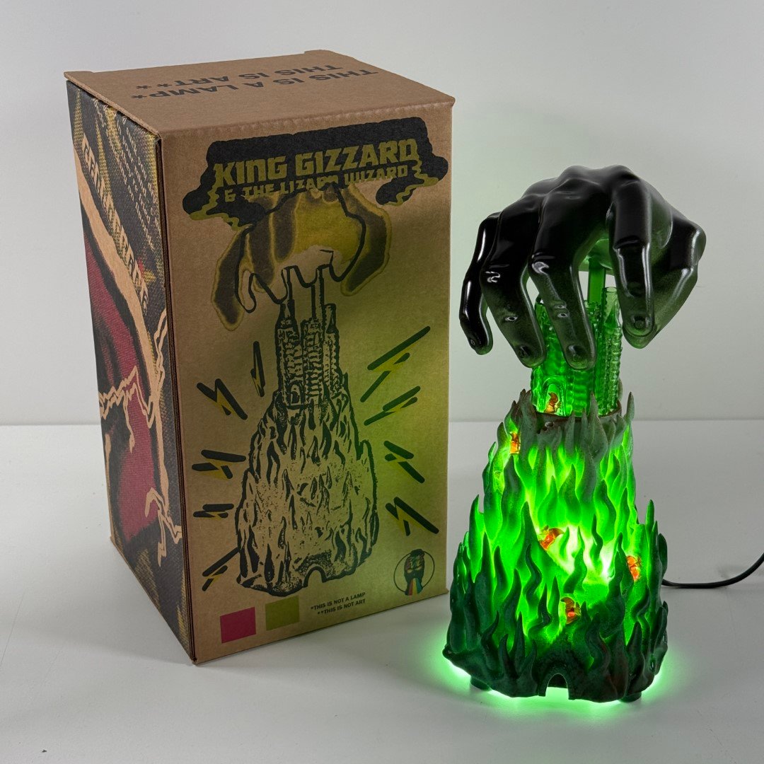 Scratch built art sculpture lamp based on Jason Galea's I'm In Your Mind Fuzz LP cover artwork, based on the 1983 Fortress Video Game box art. This is 13" tall with a corded 100w LED light. Comes in a custom box.