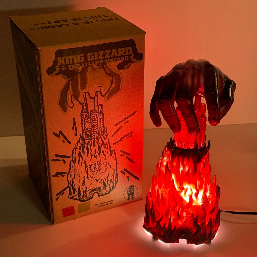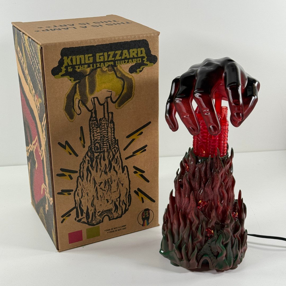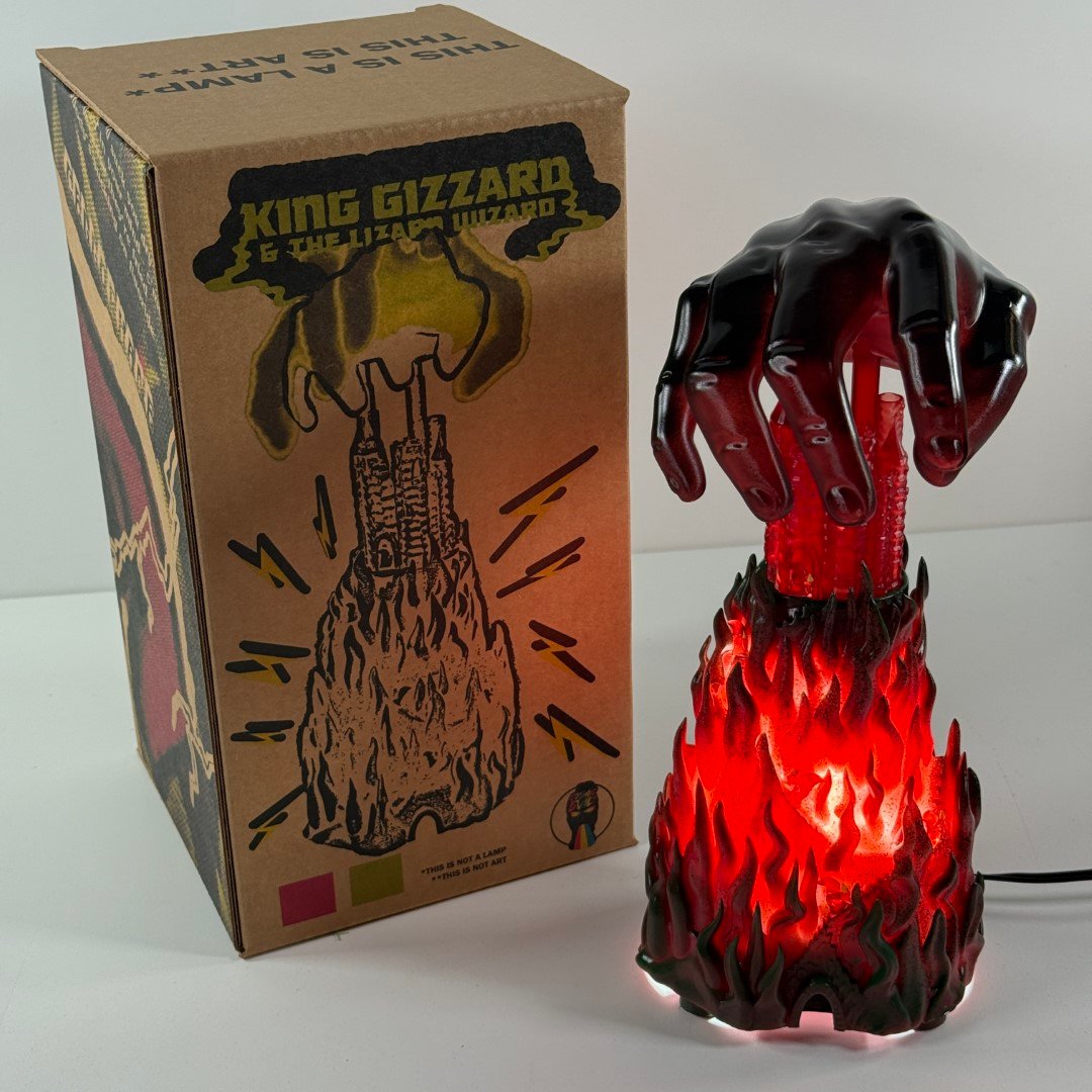 Scratch built art sculpture lamp based on Jason Galea's I'm In Your Mind Fuzz LP cover artwork, based on the 1983 Fortress Video Game box art. This is 13" tall with a corded 100w LED light. Comes in a custom box.